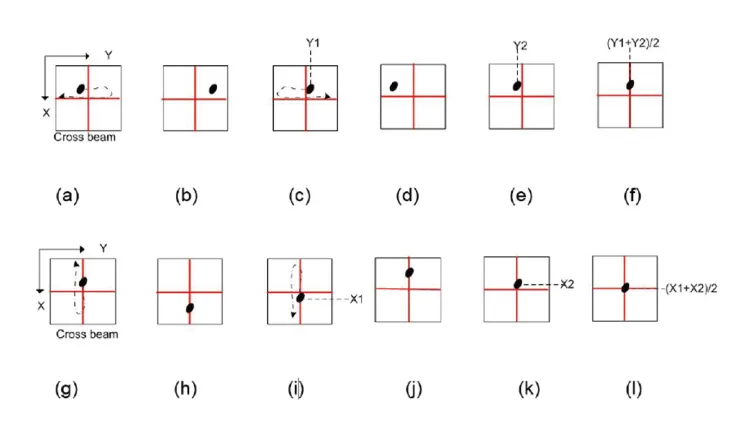通過兩條對(duì)射光路構(gòu)成一個(gè)二維坐標(biāo)體系XY。機(jī)器人或XYZ平臺(tái)移動(dòng)待校準(zhǔn)針頭在激光對(duì)針傳感器的中心附近搜索,接著引導(dǎo)待校準(zhǔn)物沿著Y方向從右向左移動(dòng),當(dāng)待校準(zhǔn)物第一次接觸到激光束時(shí),標(biāo)記為Y1,當(dāng)待校準(zhǔn)物剛離開時(shí)的位置標(biāo)記為Y2,Y方向的中心位置即為(Y1+Y2)/2的坐標(biāo),同理可找X軸的中心位置;在定位XY的中心點(diǎn)后,將針頭移動(dòng)到中心點(diǎn)位置,向上提起針頭,當(dāng)出現(xiàn)兩個(gè)激光束同時(shí)消失,即為Z軸零點(diǎn),結(jié)合以上即可確定針尖的空間零點(diǎn)。