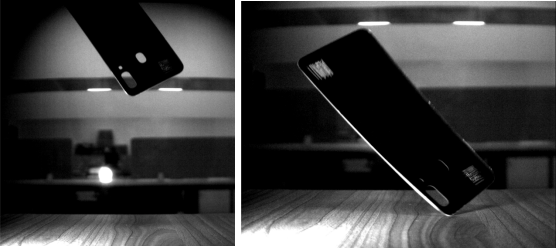 在機(jī)器視覺應(yīng)用中還有一項(xiàng)考驗(yàn)手機(jī)質(zhì)量和抗沖擊性的重要內(nèi)容,那就是跌落實(shí)驗(yàn)。跌落實(shí)驗(yàn)是基于抽檢方式,利用高速工業(yè)相機(jī)系統(tǒng)快速捕捉手機(jī)跌落的碰撞瞬間,通過對形變圖像的分析,為產(chǎn)品結(jié)構(gòu)和材料的優(yōu)化提供數(shù)據(jù)指導(dǎo)。