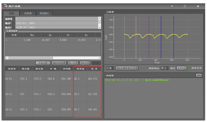 截取計算三個凹槽的深度寬度數(shù)據(jù)分別為:凹槽1深度26.2um,寬度164.4um、凹槽2深度28.1um,寬度151.4um、凹槽3深度28.7um,寬度158.4um。