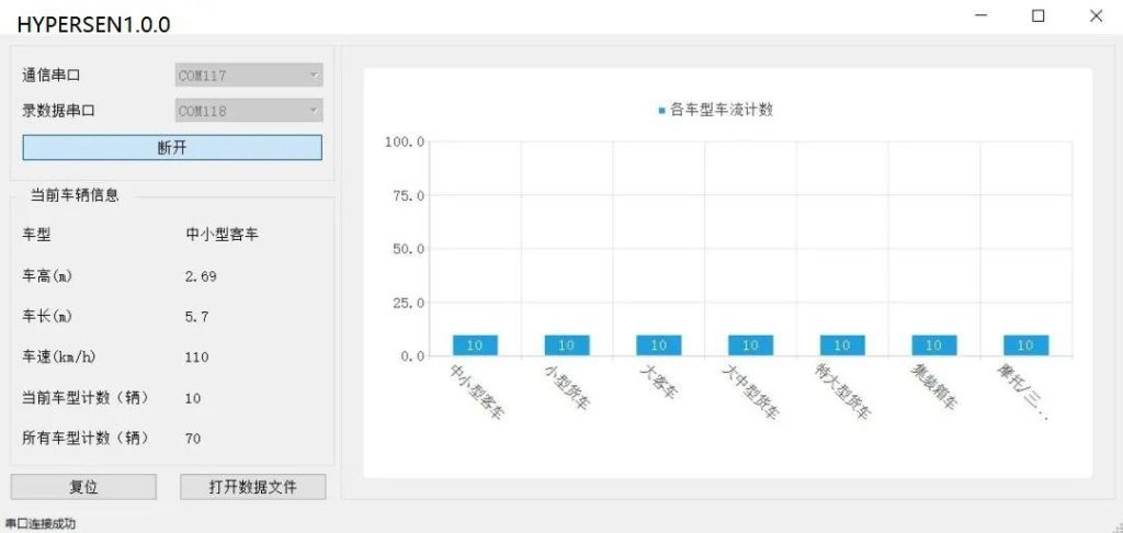 安裝HYPERSEN 車型識別上位機, 可以進行接收、顯示、保存數(shù)據(jù)、保存調(diào)試信息、復(fù)位工裝等操作。