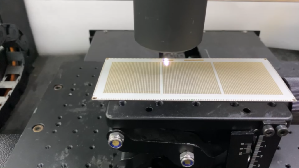 考慮到PCB鉆孔的孔直徑和過孔間距小,斜射式測量容易產(chǎn)生遮擋盲區(qū),因此可以選用點間隔小、測量點密集、角度兼容性好的同軸式3D線光譜共焦傳感器HPS-LCX1000配合控制器HPS-NB3200進行測量。
